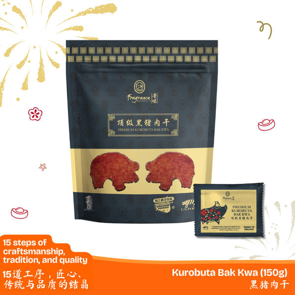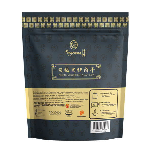 This Black Pork Bak Kwa is made using 100% USA Berkshire pork, also known as Kurobuta. The meat is marinated with our signature blend of 18 herbs and spices, then grilled to bring out its natural richness and tenderness.
